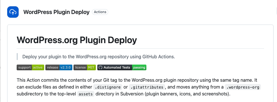 二つ目は WordPress Plugin Asset Update Action で、readme やアセット更新の自動同期を担当します。指定ブランチへの push でトリガーされ、readme ファイルや画像アセットのみを WordPress.org に更新します。説明文修正、スクリーンショット更新、対応バージョン変更などに活用できるでしょう。