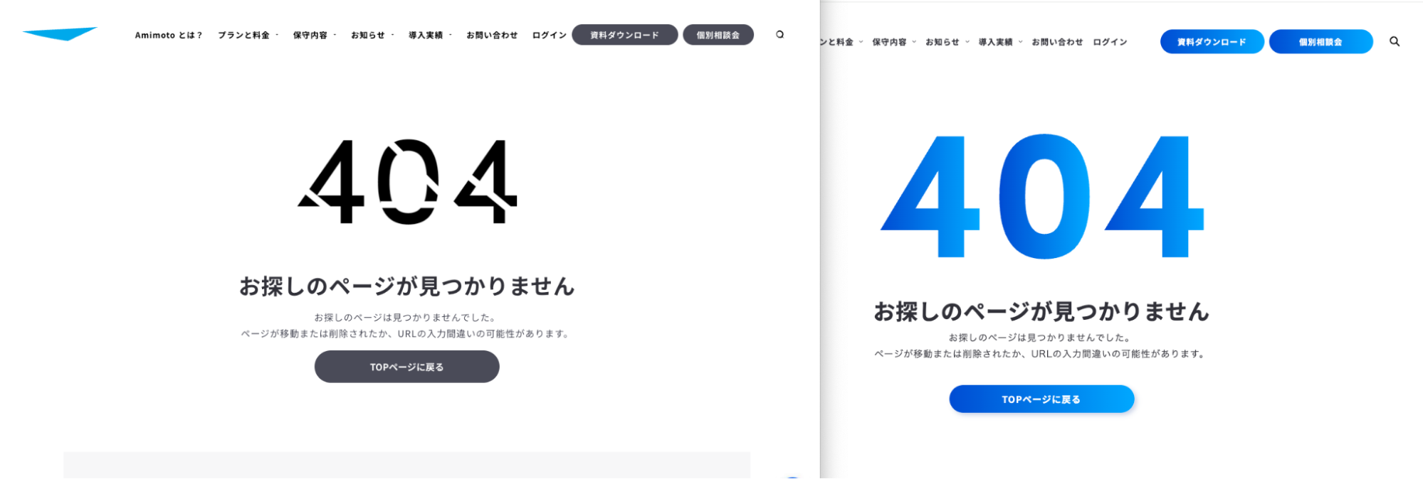 実際のサイトで表示されている 404 ページと比較した画像がこちらです。細かくみていくと配色や画像などの差分が気になりますが、大まかなレイアウトや構成については再現されていることがわかります。
