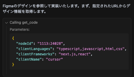 Cursor に作業を指示すると、Figma MCP を利用してデータの取り込みが始まります。