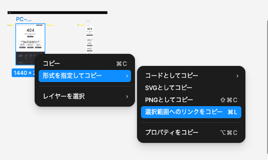 Figma MCP を使っている場合、デザインの共有方法は URL です。対象となるレイヤーを Figma で選択し、「選択範囲へのリンクをコピー」をクリックします。