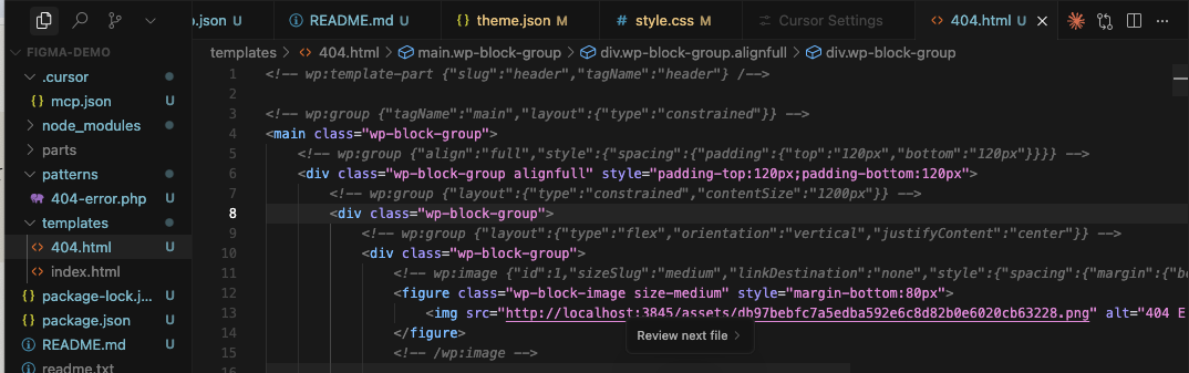 初回のタスクでは配置に問題がありましたが、「ブロックテーマのディレクトリ構造に一致していない。修正して」と修正指示を出すことで、 templates/404.html などブロックテーマとして利用できる形でファイルを作成してもらえました。
