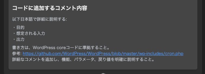 場合によっては WordPress のコードベースを分析し、コメントやドキュメント生成のルールを生成した上で、コーディングエージェントのルールやナレッジに設定することも検討しましょう。