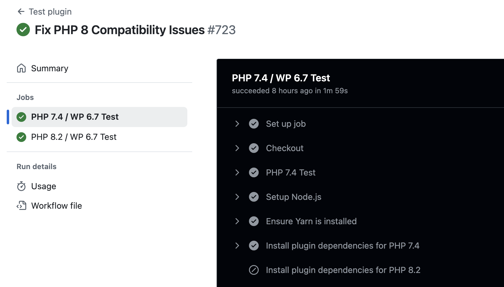 デジタルキューブの C3 CloudFront Cache Control プラグインでは、PHP 7 とPHP 8 どちらでもテストが失敗しないかをテストしています。これによって Devin が意図しない変更を入れていないかを GitHub Actions で検知できます。