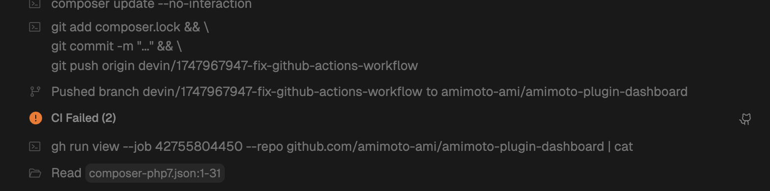Devin のようなコーディングエージェントは Pull Request 作成後、CI 実行結果を監視します。もし CI が失敗した場合は、そのログから何を壊したかを自分で調査し、問題解決のための作業を追加で行い、最終的に CI がパスするまで自律的に作業してくれます。