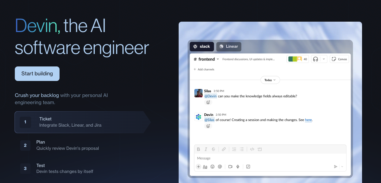 そこで今回注目したいのが、AI コーディングエージェントの活用です。特に Devin(Cognition Labs 開発の自律型 AI エンジニア)は、Slack や GitHub から指示を受けて要件を満たすまで開発を継続し、最終的に Pull Request を提出してくれます。単純なコード生成にとどまらず、CI のエラーを検知して自ら修正するなど、まるで一人のエンジニアのように振る舞う点が革新的です。